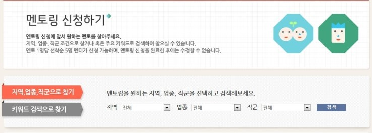 ② 멘토링 신청하기 메뉴에서 지역, 업종, 직군과 멘토 소개까지 꼼꼼히 읽어보고 멘토를 신청합니다.