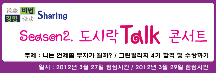 지난 3월 27일 세번째 도시락 토크콘서트가 열렸습니다. 20명의 학우와 함께한 이번 강연은 창의력 컨설턴트 박종하 강연자의 '나는 언제쯤 부자가 될까?' 라는 주제로 진행되었습니다.