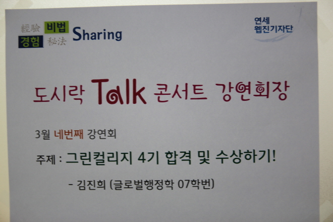 지난 29일 도시락Talk 4번째 특강에서 대통력직속 녹색성장위원회주최 그린칼리지 2기로 활동했던 김진희학우(07 글로벌행정)의 경험과 비법을 공유했습니다.