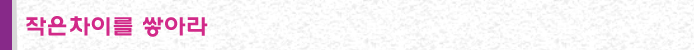 이처럼 작은 차이가 쌓이면 큰 차이를 만듭니다. 부자가 어느 날 갑자기 부자가 될까요? 연예인의 인기는 어느 날 갑자기 생길까요? 성적은 갑자기 오를까요? 이 모든 것들은 갑자기 이루어지는 것처럼 보입니다. 하지만 보이지는 않지만 조금씩 조금씩 쌓아 둔 것이 어느 날 눈에 보이게 나타난 것은 아닐까요? 강연자는 말 합니다. "성과가 눈에 보이지 않는다고 포기하지 마십시오."